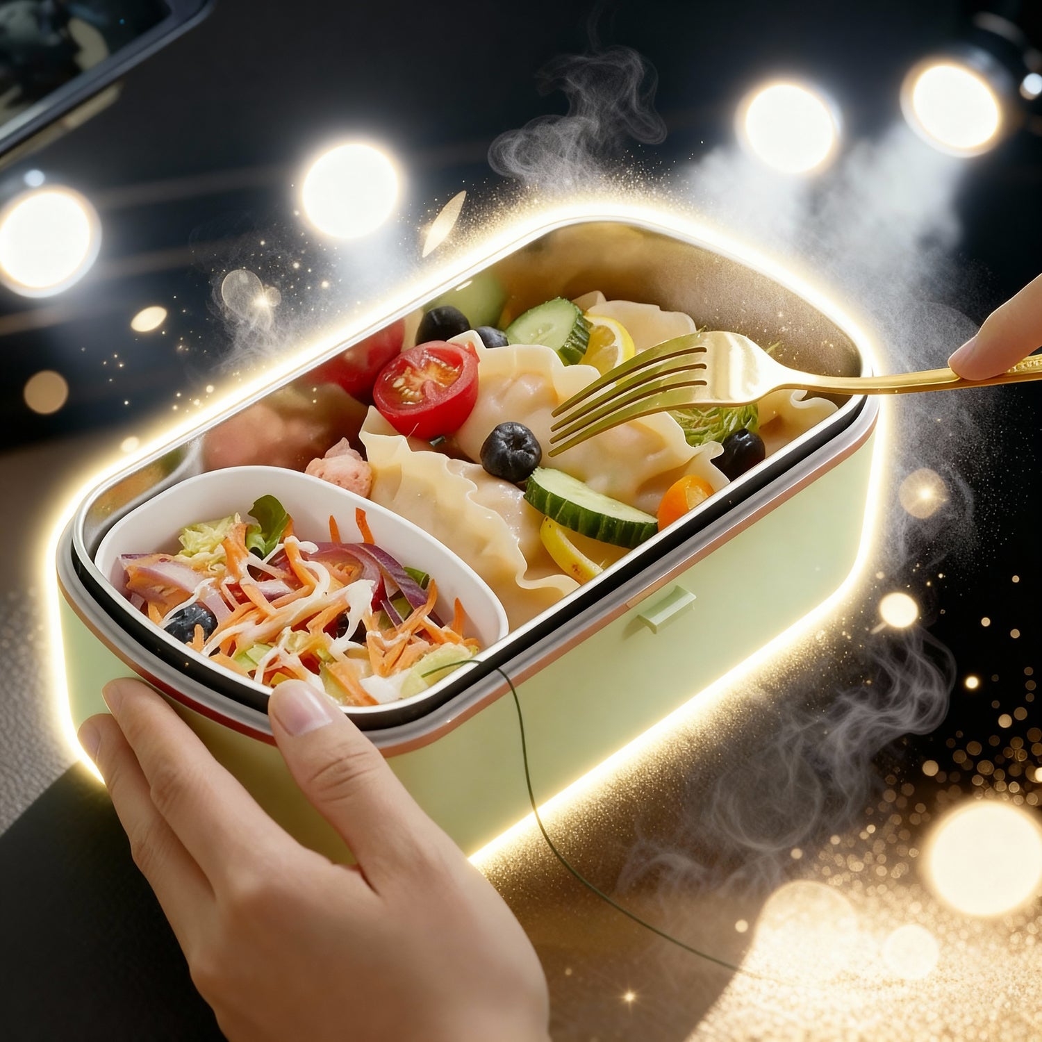 Smart self-heating lunchbox that keeps your meals hot and ready anywhere you go — compact, rechargeable, and designed for life on the move